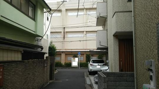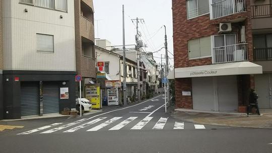 向かい側歩道の質屋さんとケーキ屋さんの間の路地に入ります。(向かい側への横断の際お気を付けください)