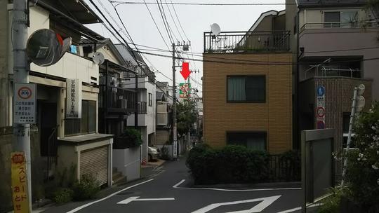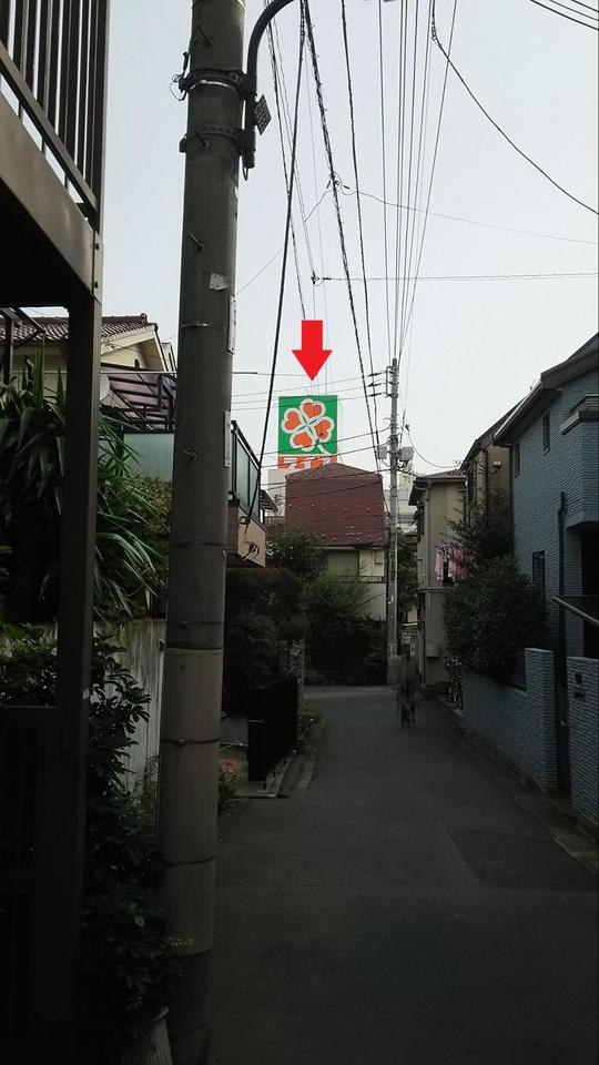 進んでいくとライフの看板が徐々に見えます(赤矢印)