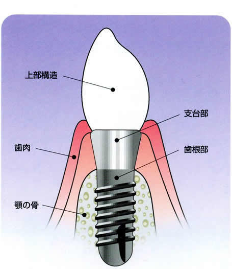 インプラントは歯が欠損してしまっているところに、チタン製の根(フィクスチャー)を埋入し、その上に冠による上部構造を作ります。上部構造をマグネットとし、義歯の支えにすることもあります。