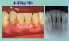 進行具合は、歯ぐきから出血や膿が出る、くらいの状態です。歯周ポケットも深くなりはじめ、違和感を感じることがあったり、口臭が気になり始めます。体の抵抗力の低下などにより炎症が急性化し痛みや腫れが増すこともあります。歯肉の退縮により冷たいものが凍みたりします。(知覚過敏の出現)