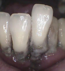 長期に渡る清掃不良のため、根元に真っ黒な歯石が厚く付着しています。左下 1 番(向かって右の歯)は完全に位置がずれ浮いてしまっています。